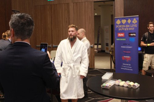 Till tämligen stor munterhet dök Magnus Betnér upp i lokalen iklädd badrock. Det visade sig att han tagit med sig fel kort när han lämnade hotellrummet för att ta sig till spa-avdelningen. Problemet löstes, men givetvis inte utan fotodokumentation av SM-general Mauritz Altikardes (och uppenbarligen även oss på Poker.se).
