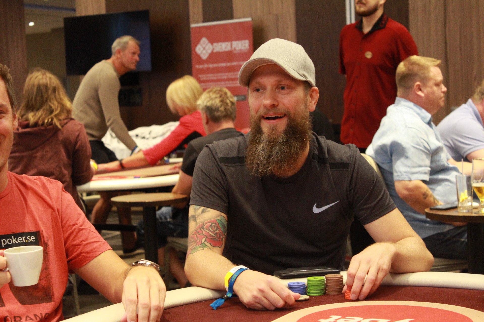 Magnus Betnér har just anlänt till fältet, och sitter nu till vänster om Matz Svensén och Nisse Jarefjäll. Även den regerande mästaren i main event, Olof Haglund, är nu med i turneringen.