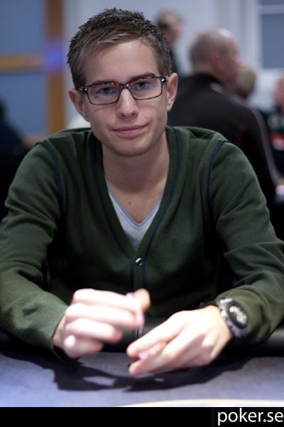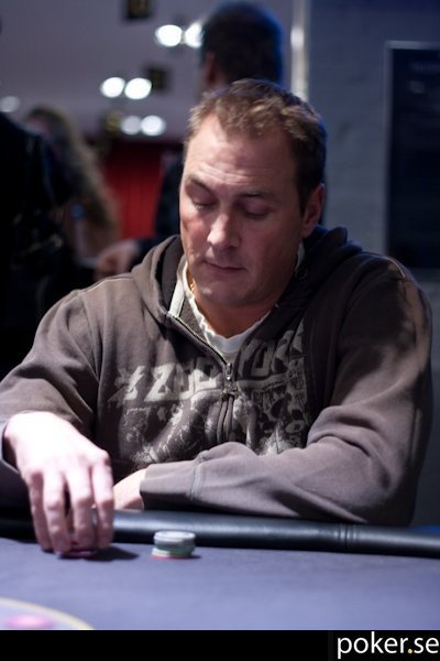 Det var tur att vi fotade Mikael Norinder tidigt, för nu är han utslagen efter att han och Oscar Kroon (Kronan på forumet) standardbetat hela vägen till river med KK mot QQ. Korten låg K9299 på brädan till slut, och ni får själva lista ut vem som hade vilken hand…