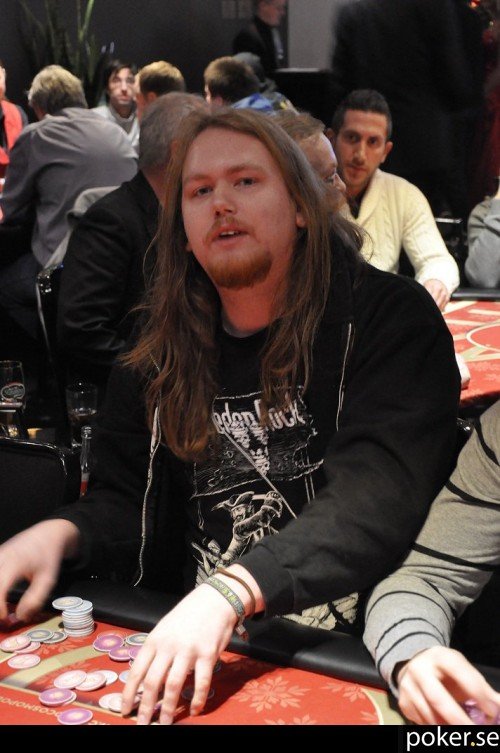Efter lite drygt 18 minuters spel har vi turneringens första bust. På brädan ligger T♣ K♠ Q♠ 5♣ Q♦ och det är tre spelare med. Spelare ett checkar, spelare två betar ut 5000 och Oscar Kroon slår om till 13,250. Spelare ett foldar och spelare två säger "igår gick det bra så jag sa att imorgon ska jag vara först ut eller dubbla upp" innan han går all in. Oscar synar snabbt med KK för kåken och tar hem potten.