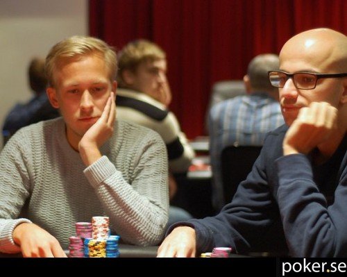 Robin Colbin öppnar till 25 000 från hijack. Syn på knapp från Stian Eriksen och av big blind Daniel Erlandsson.