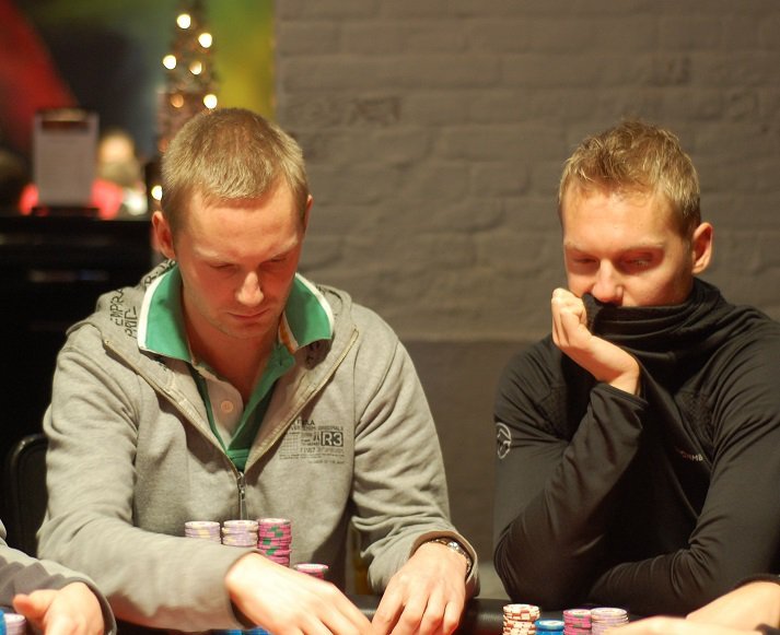 Peter Jaksland öppnar från knappen. Mattias Jorstedt trycker in stacken på cirka 65 000 från small blind. Daniel Erlandsson synar från big blind och Peter viker.
