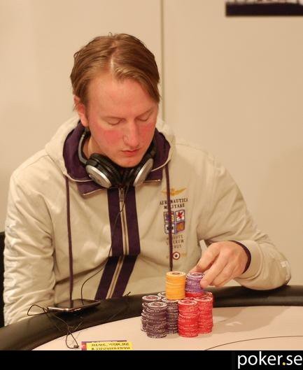 Simon Persson är nu inne i pengarna i $1000-eventet, med 24 spelare kvar. Han blir glad när jag kommer och säger ”Vad kul att du fotograferar mig när jag för en gångs skull har en skaplig stack framför mig!”