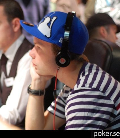 Robin Ylitalo trycker in stacken från knappen efter en höjning i mellanposition och får ett vik. Svensk pott.