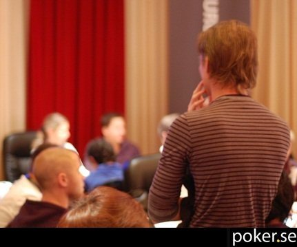 Adrian Bussman är tyvärr utslagen. I en tidig hand blev han översettad med åttor mot tior, och med en tämligen liten stack kvar åkte markerna så småningom in utan lycka för svensken.