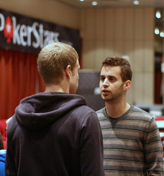 Mattias Bergström är även han nu utslagen ur turneringen och sitter och samspråkar vid railen med kamraten Alex Roumeliotis som också lämnat turneringen.