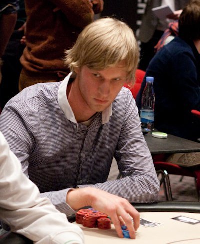 Fredrik Andersson check-synar ett bet på floppen J♥ Y♥ Y♥ och får se en blank turn.