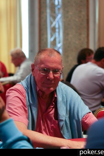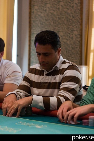 Lars ligger bra till med K♦ 8♦, men Nalle har A♦ Q♦ och förpassar Lars till de shortstackades grupp med cirka 4 500 kvar i stacken.