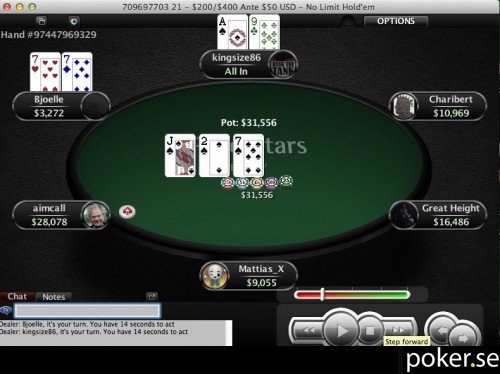 Flopp J♠2♠7♠ och Bjoelle cbettar. kingsize86 slår om, men Bjoelle ger sig inte. 4390 är 3bettet på floppen, varpå kingsize86 går all-in.