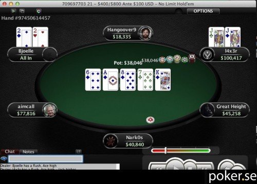 Bjoelle har 2♦2♥ och l4x3r J♦J♣. Ingen lycka på brädan och Bjoelle är ute ur turneringen.