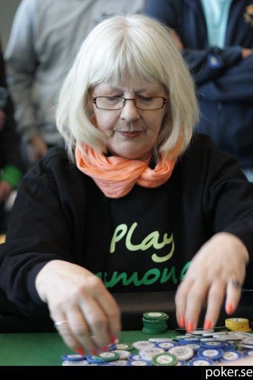 Daniel Ljung ställer för runt 90 000 och Ann-Gerd Lindström på knappen och i direkt position synar sig själv all-in för 51 000.