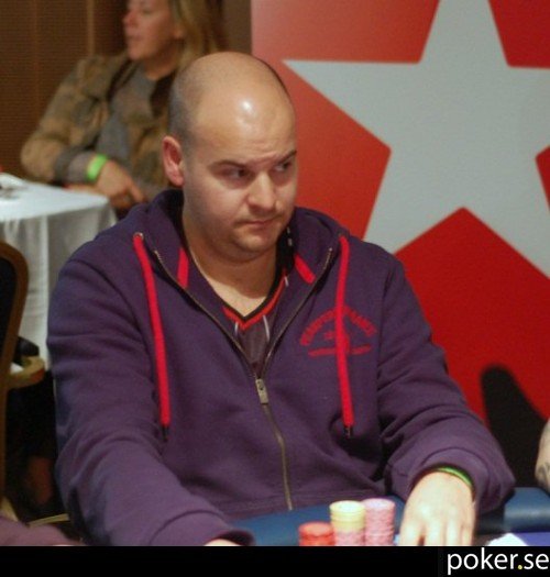 Andreas Johansson är en av de åtta kvarvarande spelarna vid finalbordet i omaha. Det märks att timmen börjar bli sen, få railare är kvar och utöver en handfull personer är det spelarna, några representanter från Svepof samt "mediauppbådet" kvar i lokalen.
