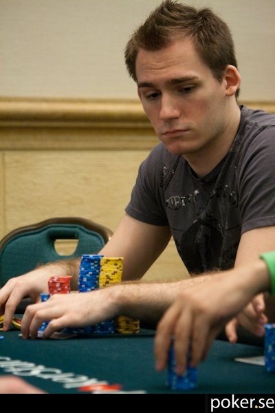 Adam Grünwald var näste svensk att busta ur main event. Han hittar AJ suited på HJ +1 och går all in med 17.5 BB och får syn av BB som har AQ. Adam hoppas på en T efter att floppen kommit KQ2, men turn och river blankar och han åker ut.