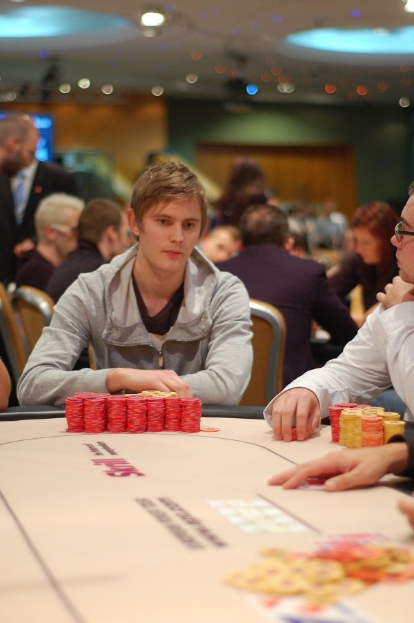 Mattias Bergström raisar preflopp till 24 000 och knappen reraisar till 52 000. Mattias slår om till 104 000 och syn från knappen. Floppen kommer 2♠8♣5♣ och Mattias betar 150 000. Syn och turn kommer 3♥. Mattias betar 180 000 och syn från knappen. River T♦ och Mattias skickar denna gång in 320 000. Knappen tänker en stund innan han viker sin hand. Mattias har nu runt 1,5 miljoner marker.