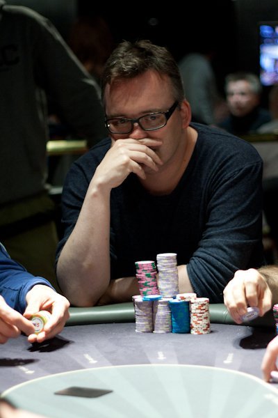 Komikern Magnus Betnér var länge med med en fin stack, men slogs ut under dagens sista hand med nior mot knektar.