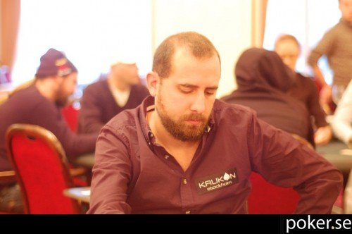 Joel Fritz från Krukan sitter direkt till vänster om Micke Norinder, och har cirka 75 000 i stacken.