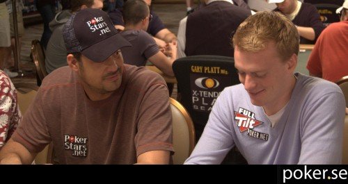 Peter Hedlund synade när en shortstack på omkring 80 000 gick all-in. Peter har QQ och motståndaren ATo. Förutom en tia på brädan händer inget mer, och Peter har nu 265 000 i stacken, medan hans motspelare får ta promenaden till railen.