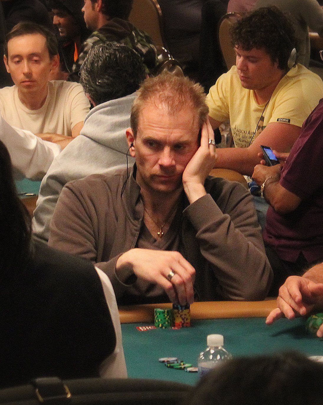 Magnus Nyholm fortsätter plocka in de små potterna. Frun sitter dock inte hemma och håller tummarna, utan ägnar sig åt eget spel på Caesars Palace i detta nu. Sonen i familjen har emellertid ännu inte åldern inne utan försöker via regelbunden telefonkontakt med pappa ha koll på hur han ligger till. Det kan vi berätta; pappa har just nu 57 000. Vidare tycker också Magnus att sonen borde sova istället för att följa turneringen, då den spelas på natten svensk tid.