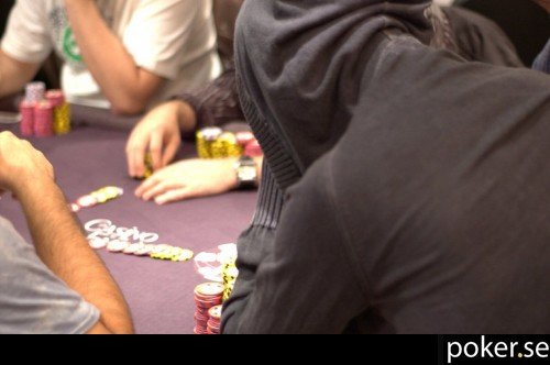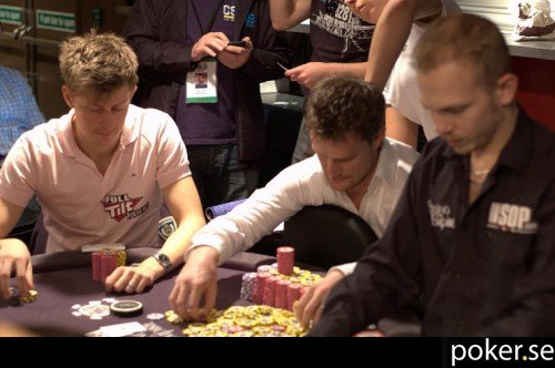 Magnus Persson har fått ett otacksamt läge att sitta bredvid chipleadern Andrew Pantling, på dennes högra sida.
