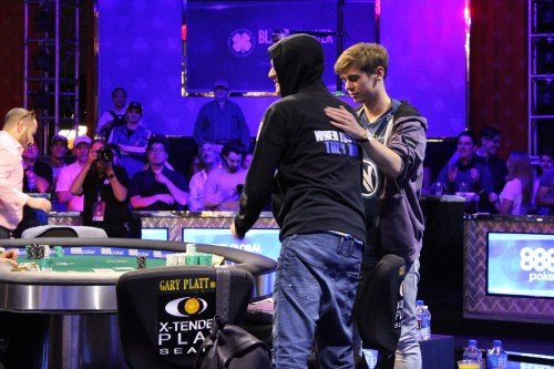 $111 111 One Drop High Roller är inne på upplösningen, och ovan ser vi Fedor Holz klappa om Jack Salter som slogs ut på fjärde plats. De tre sista spelarna är Fedor, Koray Aldemir och Dan Smith. Fedor har ett rejält markerövertag i turneringen och har slagit ut fem av de sex spelare som lämnat finalbordet.