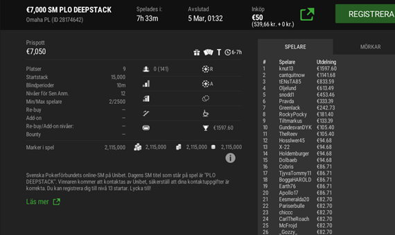 Om vi startar med PLO Deepstack som avgjordes ett par timmar före highrollern så kom 141 spelare till start vilket skapade 26 priser och vann gjorde ”knut13”.