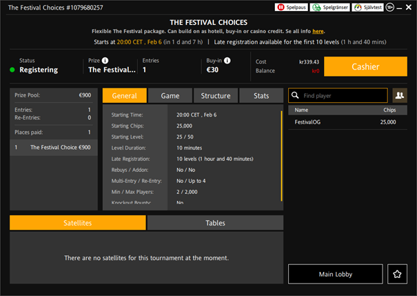 Observera : By default, a winner of “The Festival Choices” will be registered for 4 nights hotel on the dates 31st May to 4th of June unless the winner within 1 week (until the start of the next satellite) informs The Festival organizers that they would like to use their Choices!