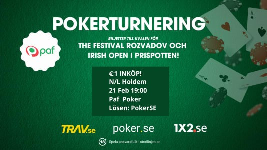 I samarbete med PAF.se har poker.se varje onsdag i februari gett er chansen att vinna biljetter i vår medlemsturnering som förhoppningsvis ska ta dig ända till Rozvadov i Tjeckien eller Dublin i vackra Irland.