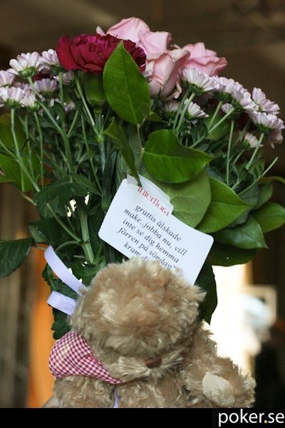 Tomas Jauring fyller år – 69 eller 70 enligt Micke Norinder – och har fått ett bud till kasinot med blommor och en nallebjörn från hans fru. Budskapet ser ni nedan: