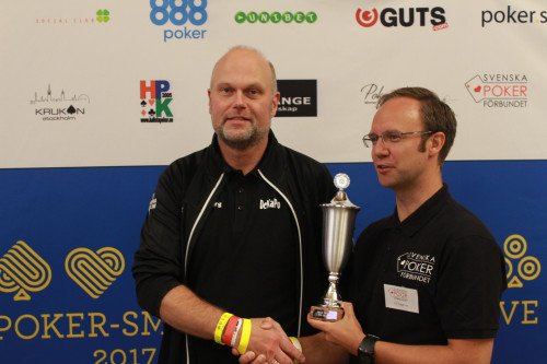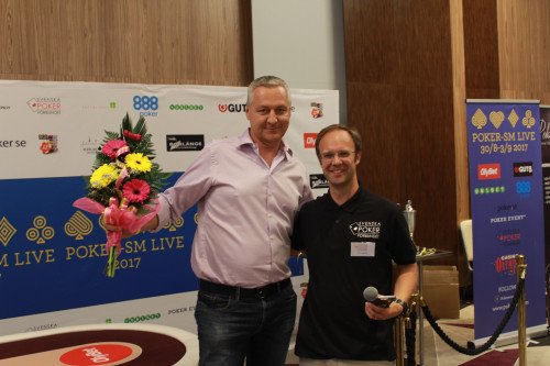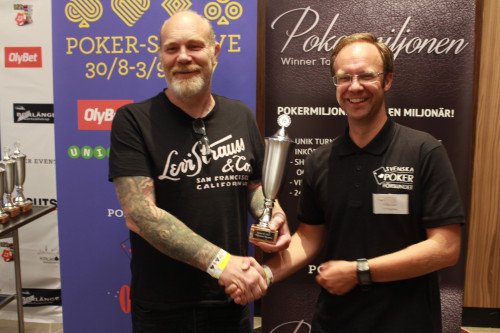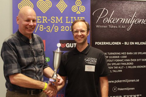 Robert Lindström, trea i main event, tillsammans med Svenska Pokerförbundets ordförande Ulf Engström.
