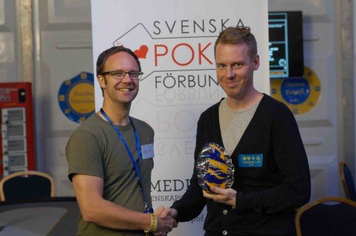 Robert Lindström, trea i main event, tillsammans med Svenska Pokerförbundets ordförande Ulf Engström.