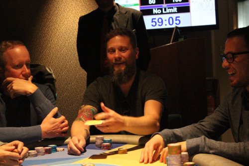 Magnus Betnér har just anlänt till fältet, och sitter nu till vänster om Matz Svensén och Nisse Jarefjäll. Även den regerande mästaren i main event, Olof Haglund, är nu med i turneringen.